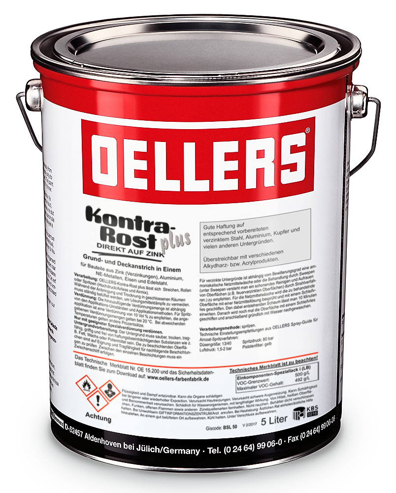 For optimum processing and adhesion of OELLERS Kontra-Rost Plus, the surfaces should be clean, dry and free from oils and greases. Depending on the weathering conditions of the substrates, we recommend a zinc wash with OELLERS Netzmittellösung.