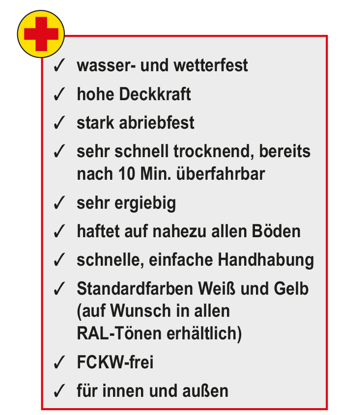 Utilisation : laque mono-composant à base de résines synthétiques spéciales pour le marquage des zones dangereuses, des sorties de secours, des voies de transport, des zones de travail, des emplacements d’entrepôt, des signalisations d’entrée ou de sortie, etc.