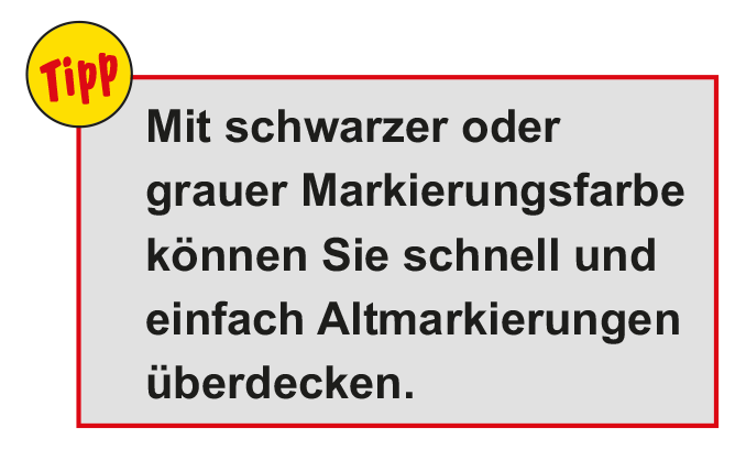 Vous pouvez appliquer la peinture pour marquage OELLERS de façon régulière à l’aide d’un pinceau ou d’un rouleau ou en choisissant nos bombes aérosol sans chlorofluorocarburesCFC. Vous pouvez à nouveau rouler dessus avec un véhicule après un court temps de séchage.