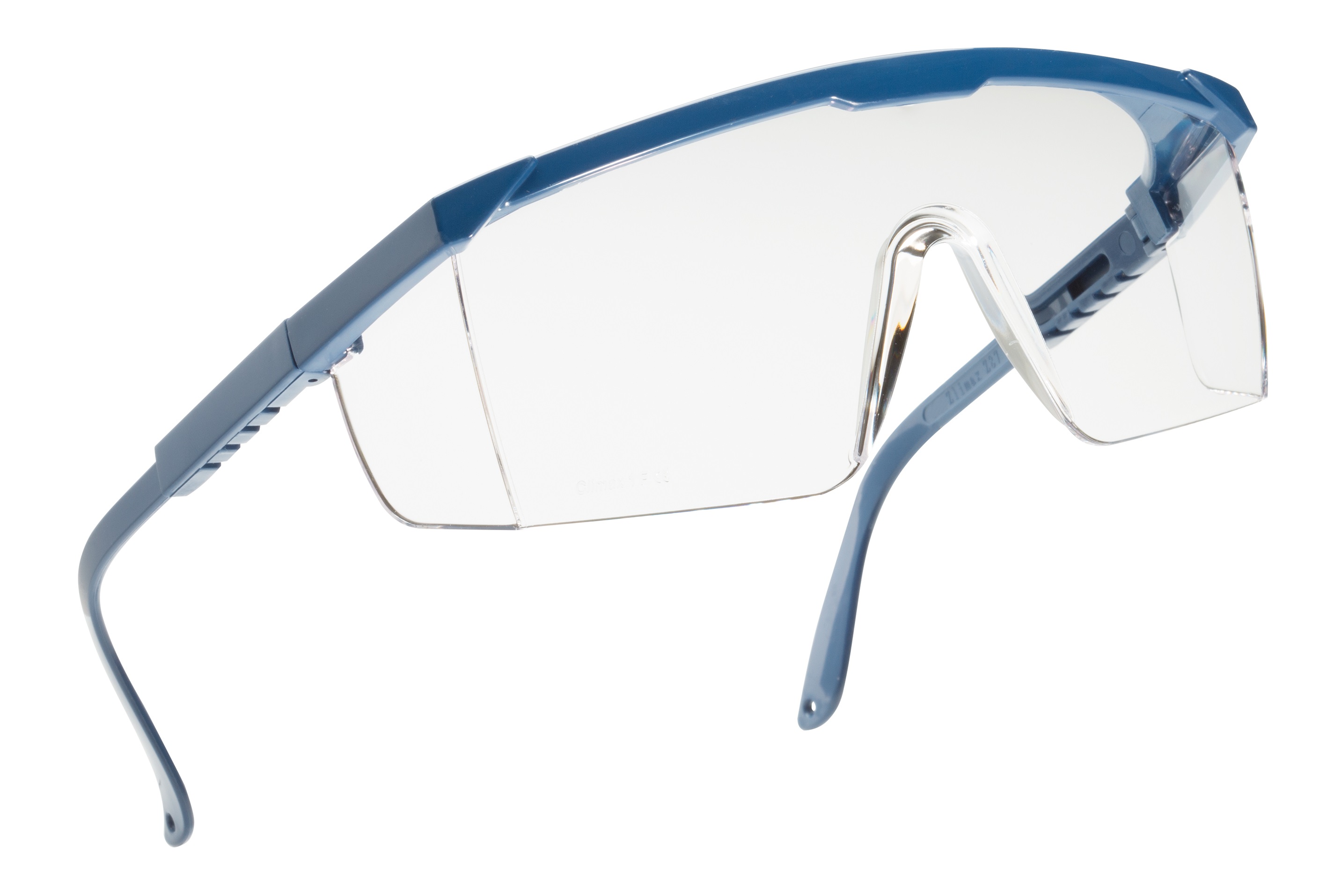Die in einem Stück gefertigte Front der Schutzbrille ist von einem blauen Polyamid Streifen umfasst.
